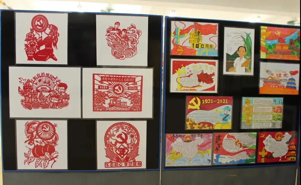翰墨飘香,丹心颂党。我校精心筹备100件围绕纪念中国共产党成立100周年的主题作品,通过手抄报、中国画、海报、剪纸、摄影等形式,歌颂中国共产党100年以来的光辉历程和伟大成就。一幅幅有着浓烈红色印记的美术作品立足党史题材,回忆峥嵘岁月,再现了党的光辉历程,令参观师生对革命先辈们的敬意油然而生,感受蕴含于作品中的艺术魅力和澎湃力量。