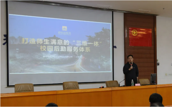 汪英武先生为参会人员作主题为“打造师生满意的“三维一体”校园后勤服务体系”的专题报告。