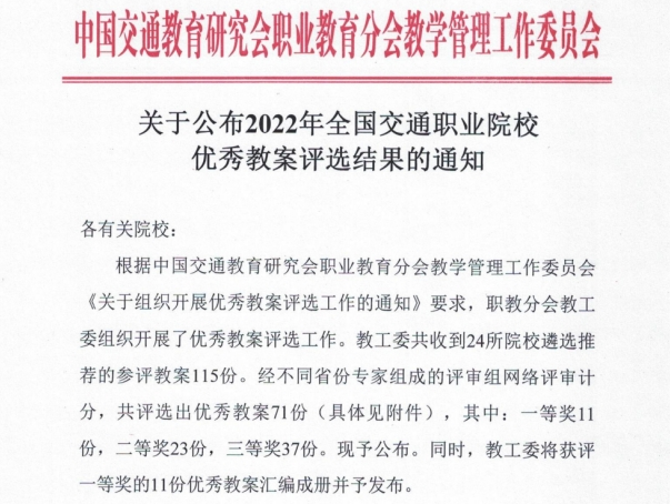 近日,中国交通教育研究会职业教育分会教学管理工作委员会组织开展了优秀教案评选工作。本次评审参评教案共有115份,经不同省份专家组成的评审组网络评审计分,共评选出优秀教案71份,其中我校共收获了一等奖2项,二等奖2项,三等奖1项。