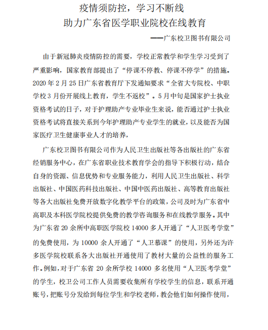 2. 暖心!一份关于深圳信息职业技术学院网课的答卷 3. 疫情须防控,学习不断线 助力广东省医学职业院校在线教育——广东校卫图书有限公司