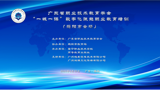 为深入贯彻党的二十大精神和全国教育工作会议、世界数字大会精神,落实教育数字化转型战略任务,高质量推进职业教育数字化转型发展,8月30日,广东省职业技术教育学会“一城一课”数字化赋能职业教育培训(揭阳市会场)在普宁职业技术学校举办。培训由广东省职业技术教育学会主办,揭阳市教育局协办,普宁职业技术学校、高等教育出版社承办,广州超星信息技术有限公司、广州鸿博文化传媒有限公司提供支持。