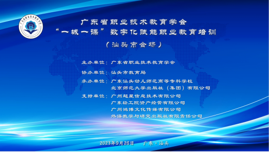 为深入贯彻党的二十大精神和全国教育工作会议精神,落实国家教育数字化战略工程,助力职业教育高质量发展,9月26日,广东省职业技术教育学会“一城一课”数字化赋能职业教育培训(汕头市会场)在广东汕头幼儿师范高等专科学校举办。培训由广东省职业技术教育学会主办,汕头市教育局协办,广东汕头幼儿师范高等专科学校、北京师范大学出版社(集团)有限公司承办,广州超星信息技术有限公司、广东轻工院资产经营有限公司、广州鸿博文化传媒有限公司提供支持。