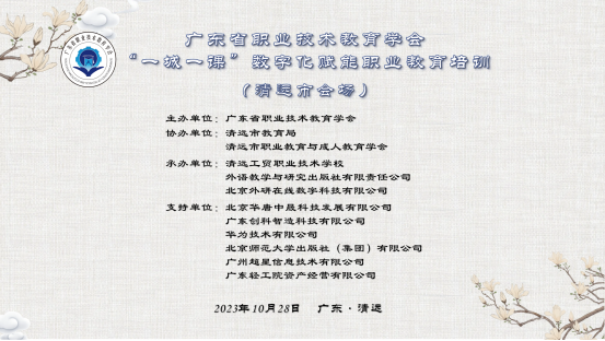 为深入贯彻党的二十大精神和全国教育工作会议、世界数字大会精神,落实教育数字化转型战略任务,高质量推进职业教育数字化转型发展,10月28日,广东省职业技术教育学会“一城一课”数字化赋能职业教育培训(清远市会场)在清远工贸职业技术学校举办。培训由广东省职业技术教育学会主办,清远市教育局、清远市职业教育与成人教育学会协办,清远工贸职业技术学校、外语教学与研究出版社有限责任公司、北京外研在线数字科技有限公司承办,北京华唐中晟科技发展有限公司、广东创科智造科技有限公司、华为技术有限公司、北京师范大学出版社(集团)有限公司、广州超星信息技术有限公司、广东轻工院资产经营有限公司提供支持。