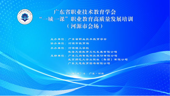为深入贯彻党的二十大精神和全国教育工作会议精神,助力职业教育高质量发展,5月24日,广东省职业技术教育学会“一城一课”职业教育高质量发展培训在河源市成功举办。培训由广东省职业技术教育学会主办,河源市教育局协办,河源理工学校、珠海天锡教育文化发展有限公司承办,广东三向智能科技股份有限公司、北京师范大学出版社(集团)有限公司、广东文思教育图书有限公司提供支持。