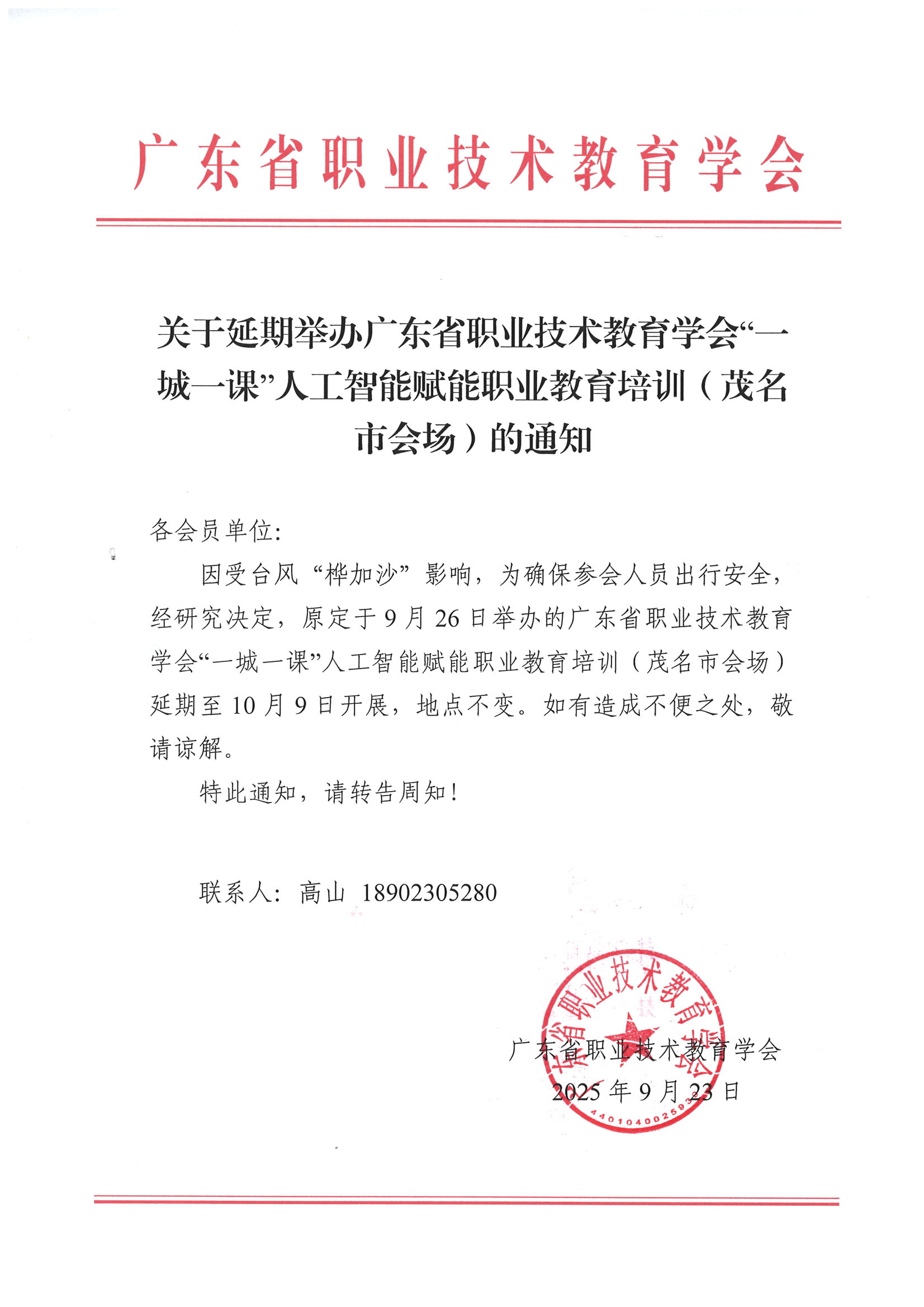 关于延期举办广东省职业技术教育学会“一城一课”人工智能赋能职业教育培训(茂名市会场)的通知