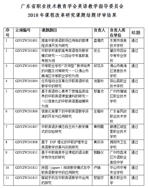 附件:广东省职业技术教育学会英语教学指导委员会2018年课程改革研究课题结题评审结果